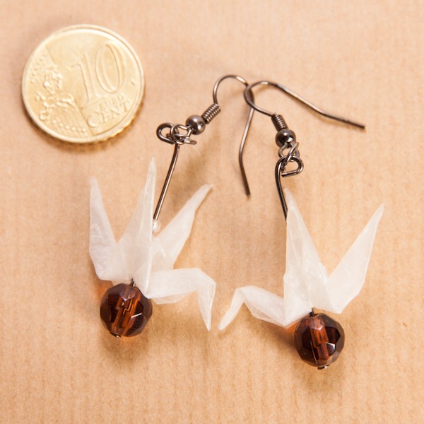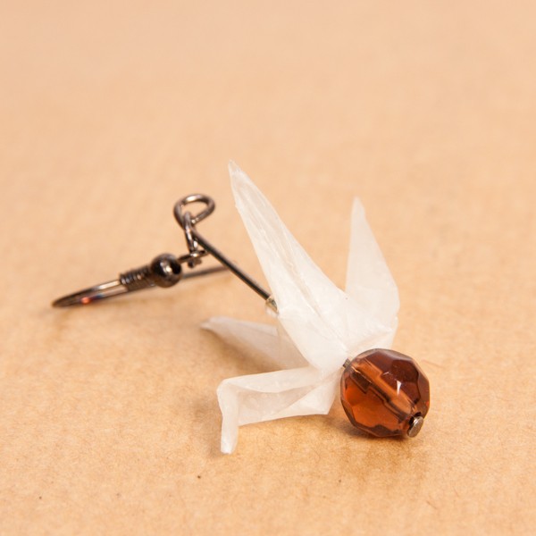 Le blanc de cette paire de boucles d’oreilles rappelle plus la colombe que la grue. Ni transparentes ni opaques, ces cocottes nous surprennent. Le papier laisse éclore de très fines bulles, à peine visibles mais qui font le charme de cette paire de boucles d’oreilles. Assise sur une perle marron translucide, la cocotte n’attend que votre oreille pour roucouler paisiblement.