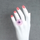 Bague en bulle de résine en forme ronde, légère et mystérieuse, renfermant une cocotte violette sur un fond rose.