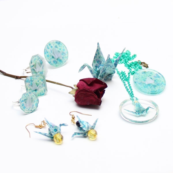 Parure de bijoux en papier liberty fleuri, bleu du myosotis. Composée d'une paire de boucles d'oreilles, un sautoir et une bague.