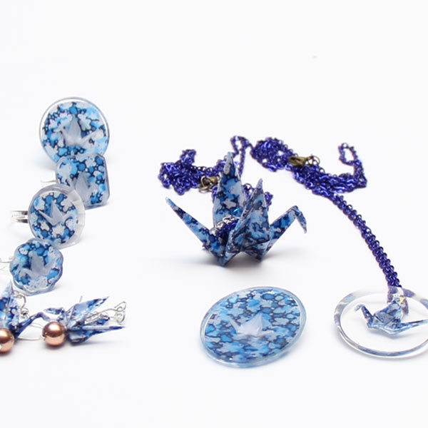 Parure de bijoux en papier liberty fleuri, bleu du Ceanothe. Composée d'une paire de boucles d'oreilles, un sautoir et une bague.