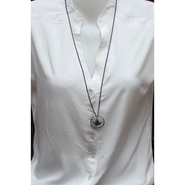 Sautoir médaillon en papier et résine liberty blanc mauve et gris